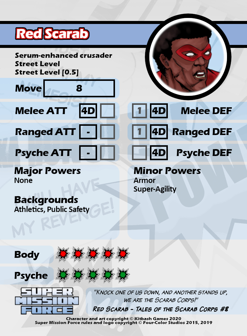 Embracing his new situation, Harlan donned a vibrant scarlet and yellow costume provided by Dani and her friend Coleen Franz. As Red Scarab, Harlan became a beacon of hope, a swift blur of justice, and a tireless protector of the innocent. With each stride, he blazed through the city, his speed unmatched by any foe, and never forgetting where he came from.